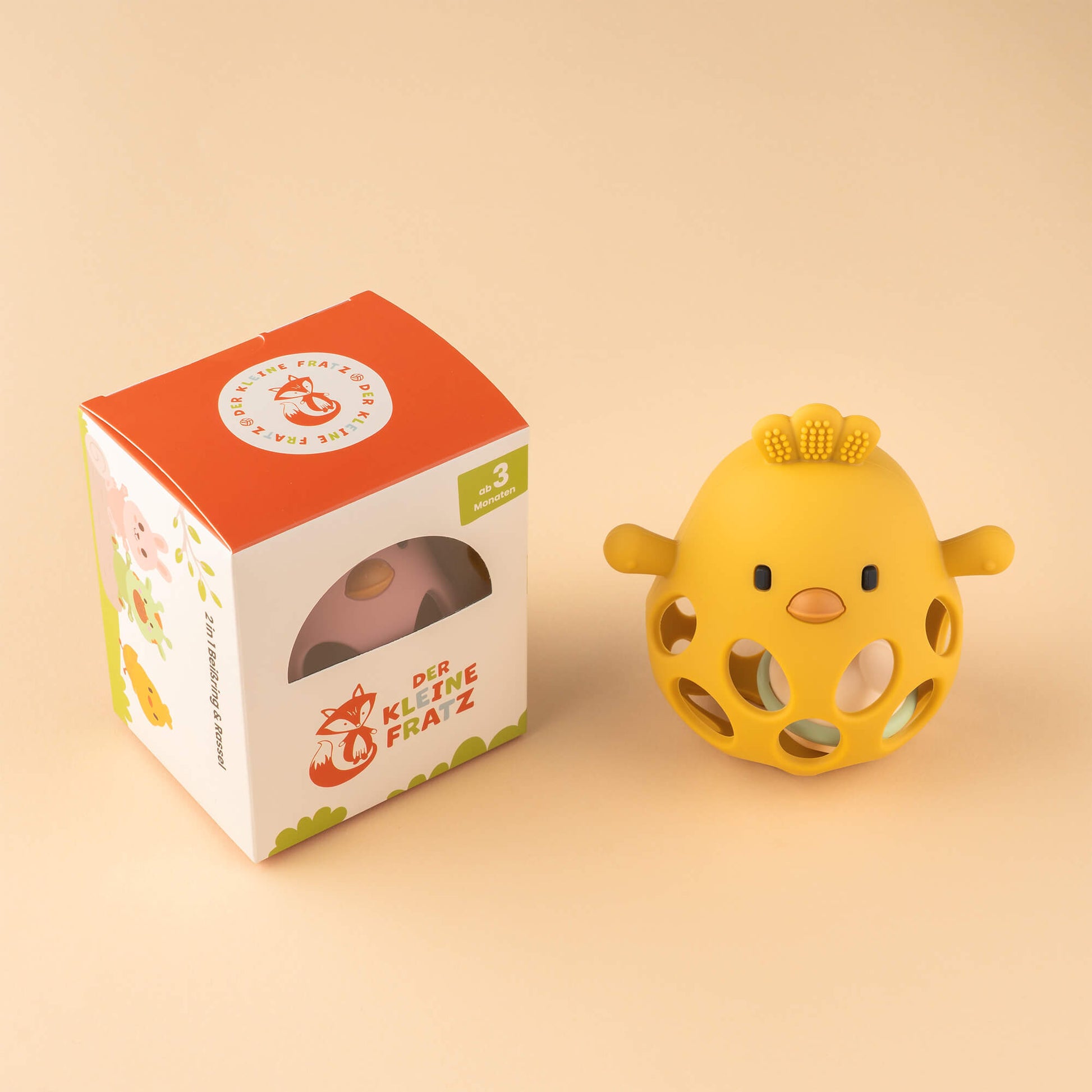 - 3-in-1: Beißring, Greifball und Rassel im fröhlichen Kükendesign
