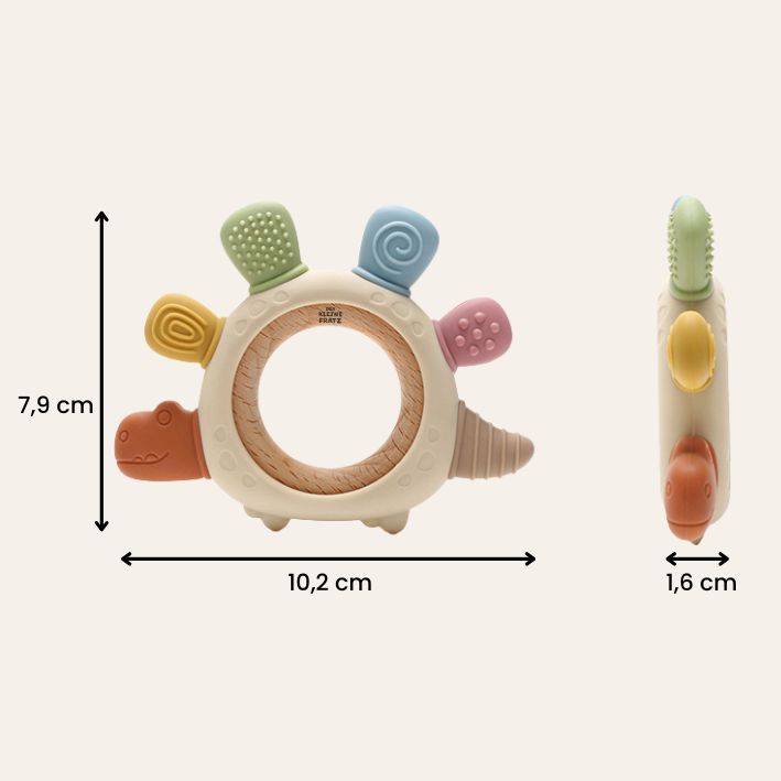 Die unterschiedlichen Strukturen auf den Beißflächen bieten Abwechslung und machen das Kauen angenehm. Dank seiner handlichen Größe können auch kleine Kinderhände den Dino leicht greifen und halten. Der Beißring ist einfach zu reinigen, langlebig und absolut sicher für den täglichen Gebrauch.