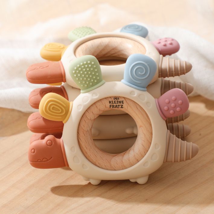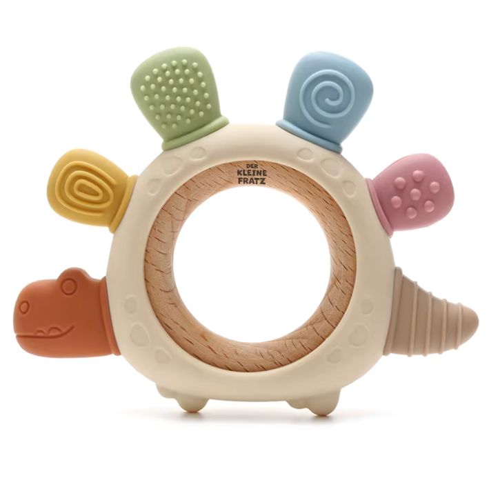 Der Dino-Beißring ist die ideale Hilfe für Babys in der Zahnungsphase. Durch seine besondere Dinosaurierform und die verschiedenen Kauflächen massiert er sanft das Zahnfleisch und lindert Schmerzen beim Zahnen. Der Beißring besteht aus sicherem, schadstofffreiem Silikon und stabilem naturbelassenem Holz. So unterstützt er nicht nur die gesunde Zahnentwicklung, sondern fördert auch den Tastsinn und die Hand-Auge-Koordination deines Babys.