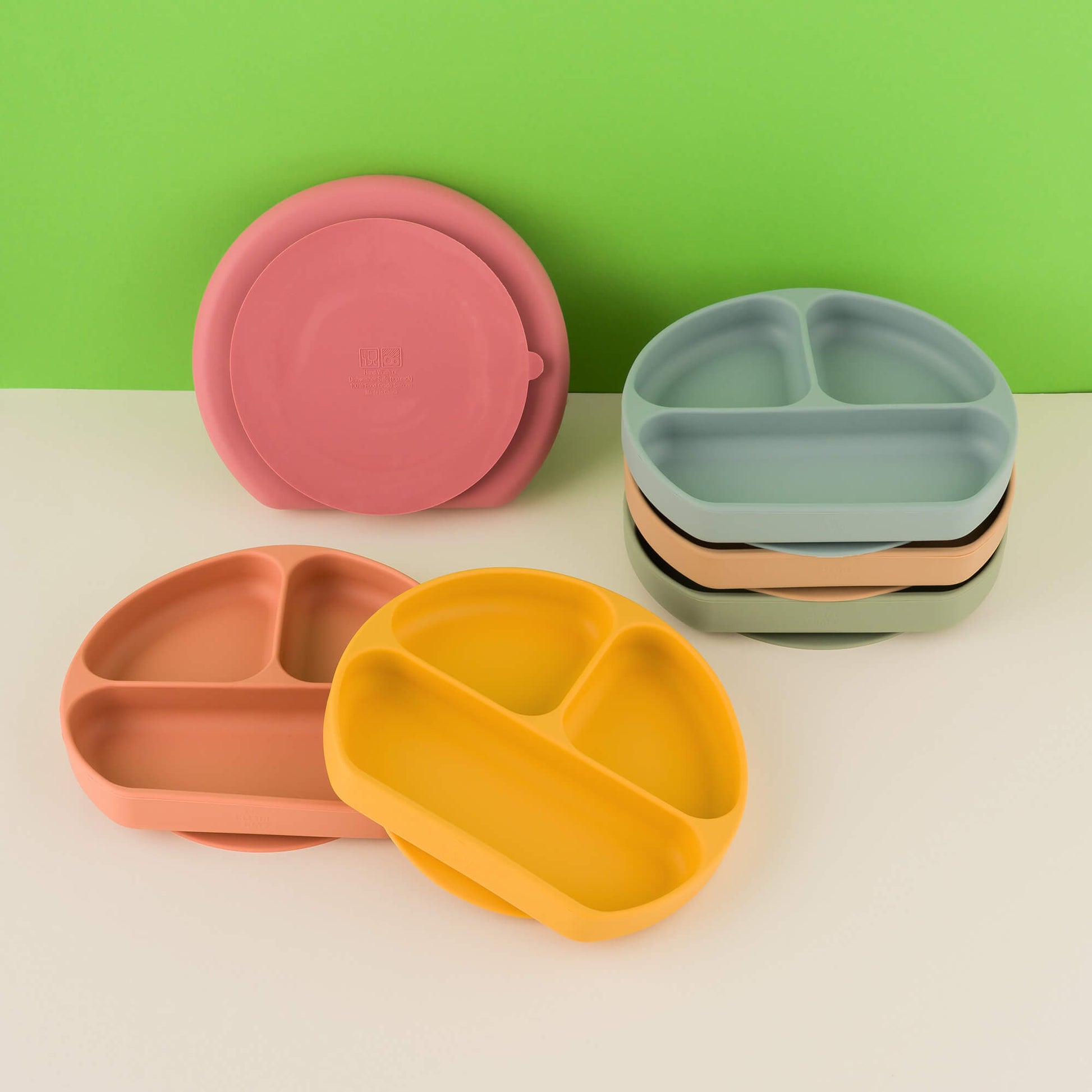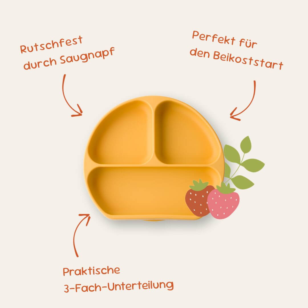 Unser Menüteller mit Saugfunktion aus Silikon und seinen drei praktischen Unterteilungen ist die perfekte Wahl, um das selbstständige Essen deines Babys zu fördern und eine ausgewogene Ernährung zu unterstützen.